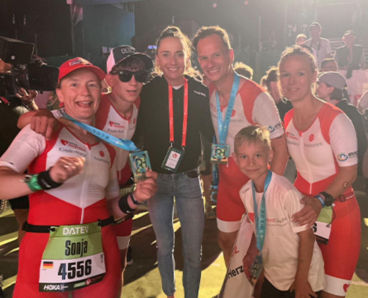 Doch Schritt für Schritt wachsen aus der Idee immer mehr Aktionen: ein Stand auf der Expo, eine Tombola, Unterstützung aus der KinderHerz-Läufer-Community aus ganz Deutschland und sogar aus der Schweiz. „Viele sind auf eigene Kosten angereist, haben geholfen, organisiert, sich eingebracht – einfach, um Teil dieses wunderbaren Gemeinschaftsprojektes zu sein.“ Der Wettkampf selbst endete schließlich mit einem ganz besonderen Moment: „Unser Zieleinlauf wurde von der Weltmeisterin und Roth-Siegerin Laura Philipp begleitet, die uns die Medaille überreichte. Das ist eine der schönen Traditionen in Roth – die Profis stehen nach ihrem eigenen Rennen im Ziel und hängen den Amateurinnen und Amateuren persönlich die Medaillen um.“